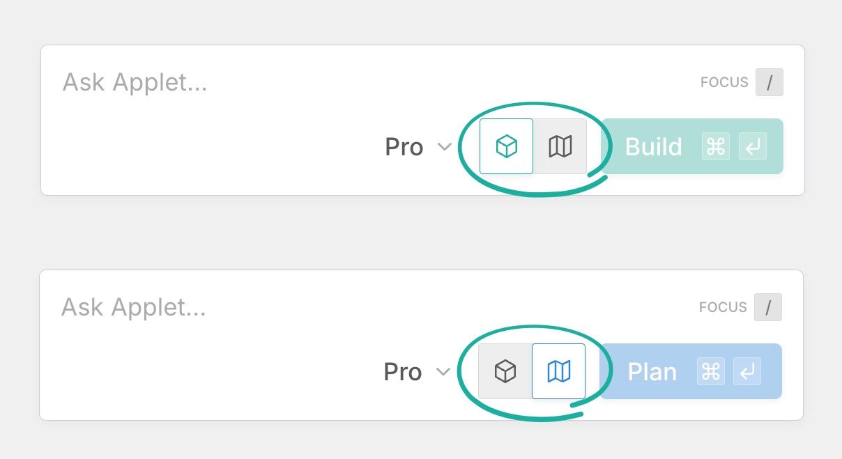 In Plan mode, the AI will take your prompt and lay out a plan for how to implement it - it will clarify anything that's unclear, and most importantly it will not make any changes to the existing versions of your applet (if there are any).