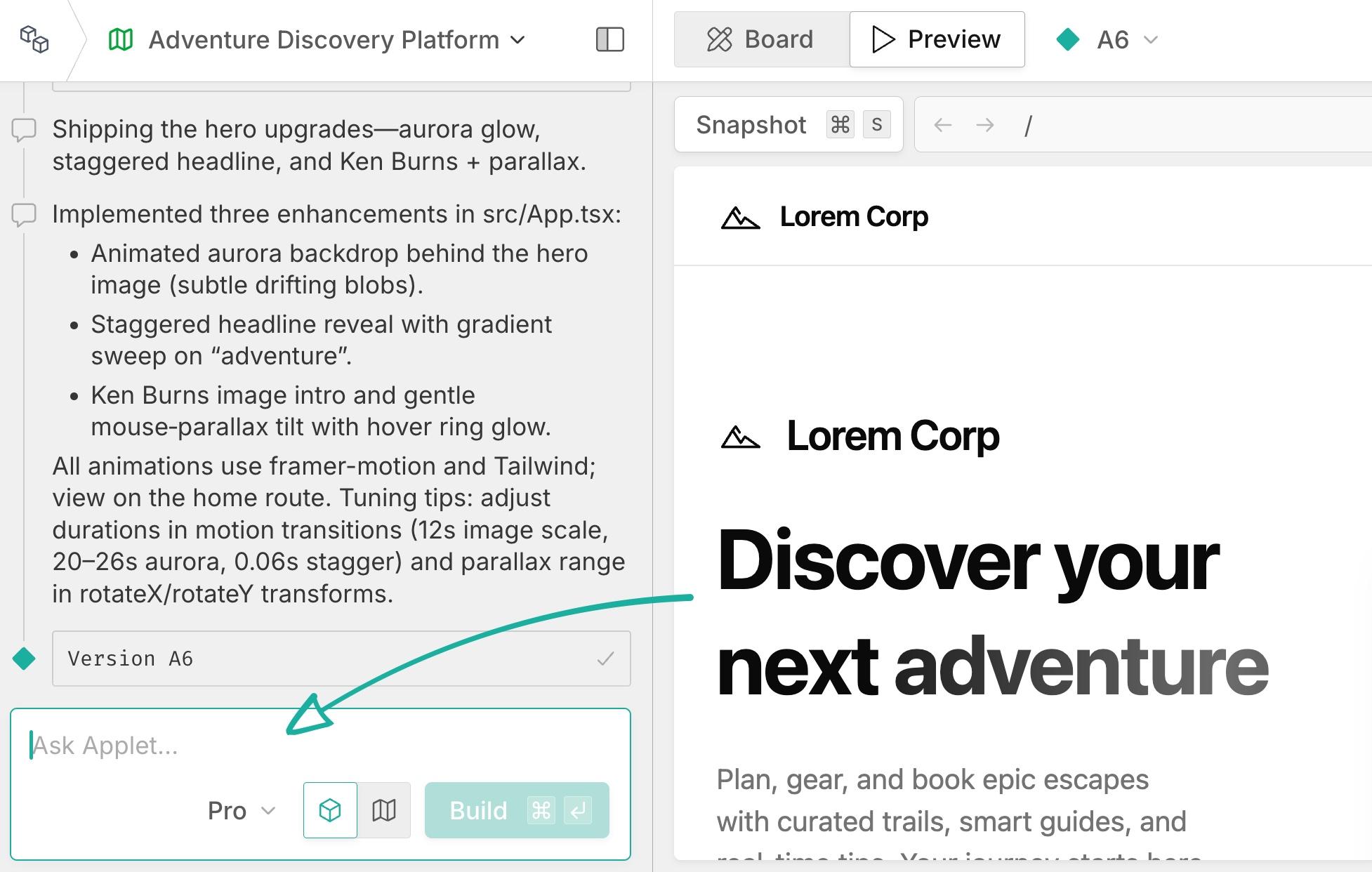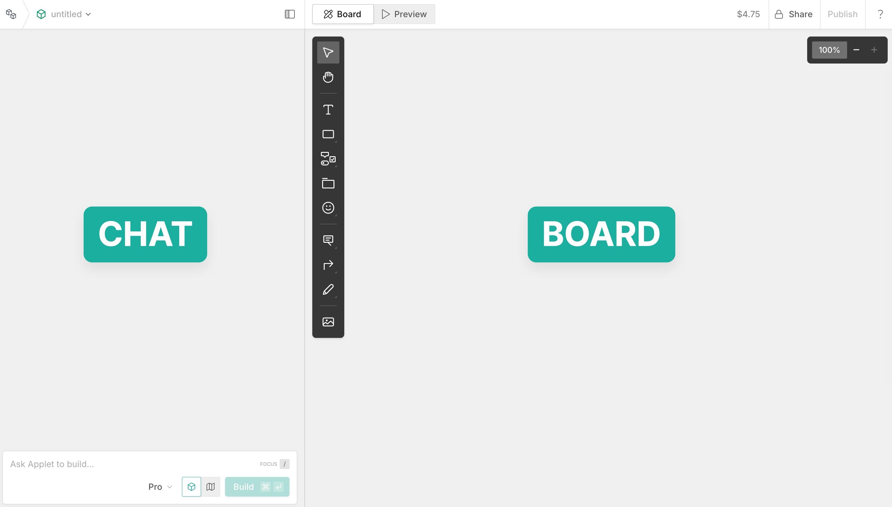 The board is what makes Applet special. We really believe in the power of human creativity, and your ability to craft something unique. While text prompts are great, they're not always the best tool to empower this creativity. So we give you a blank canvas, and a much more suitable set of...
