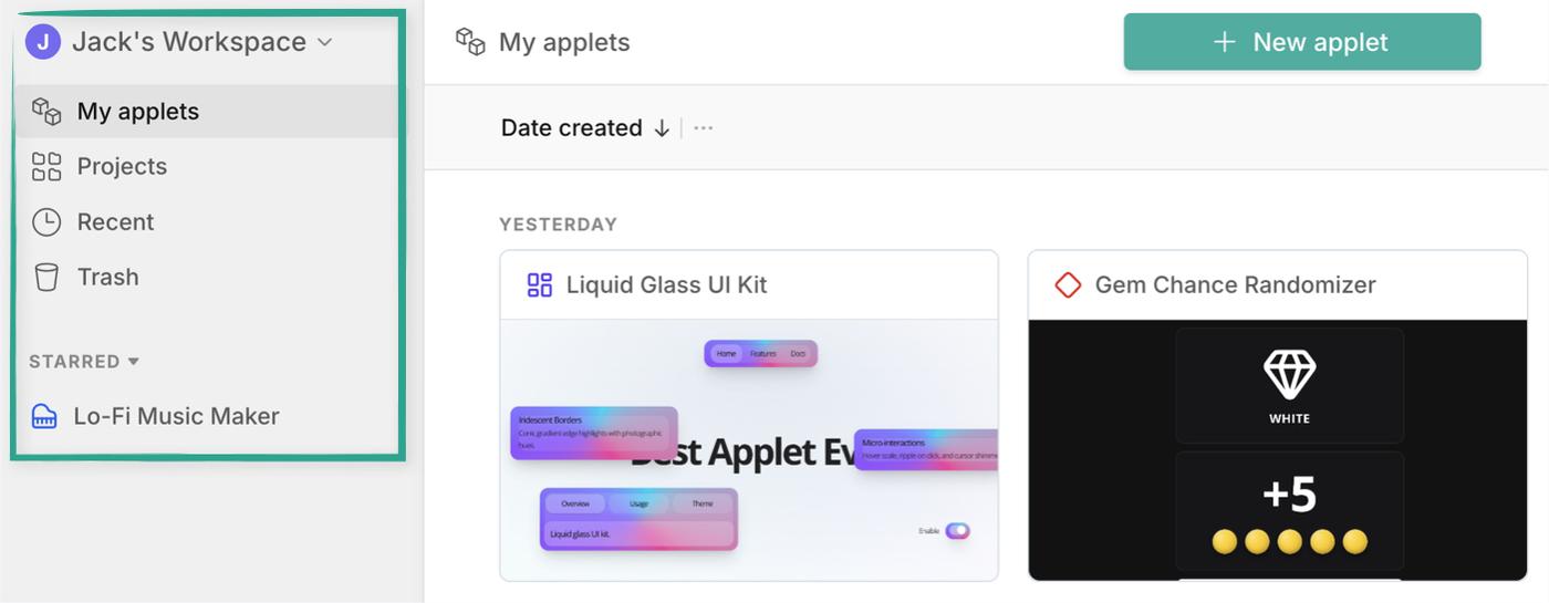 - Starred - You can “star” applets or projects so you'll always have quick access to it directly in the sidebar. (You won't see this section until you star something).