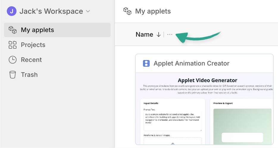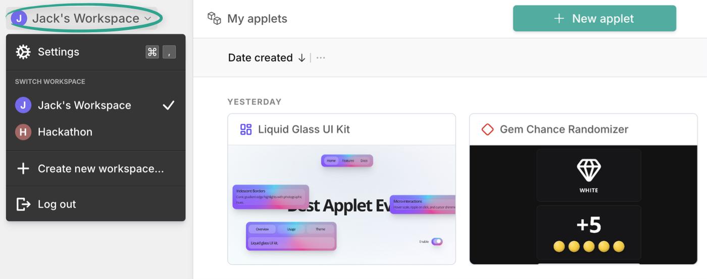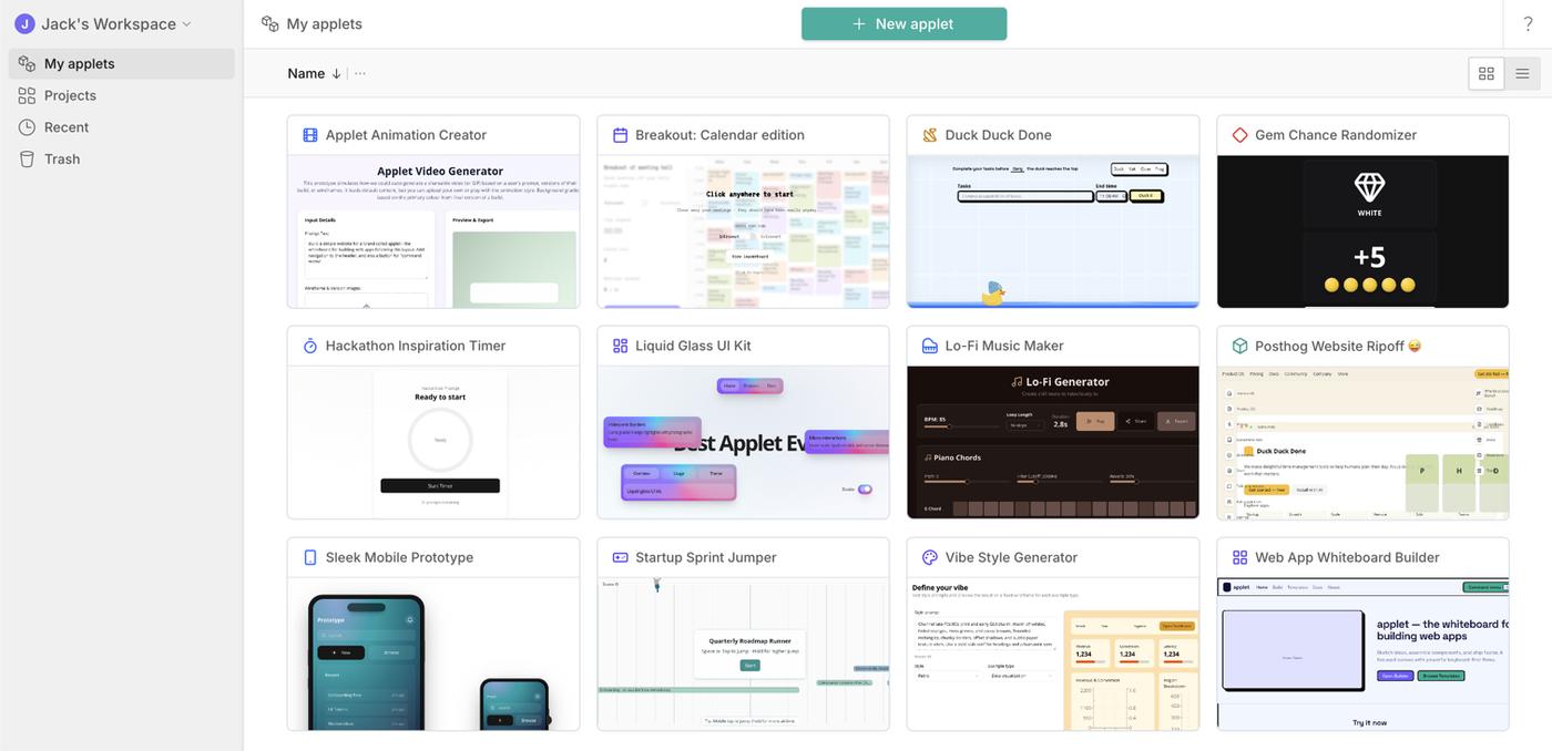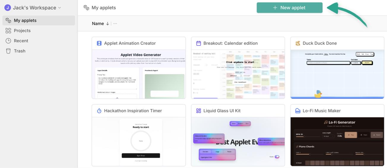 To jump back in to an applet you’ve been working on, simply click on it. To create a new applet, click + New applet in the header: